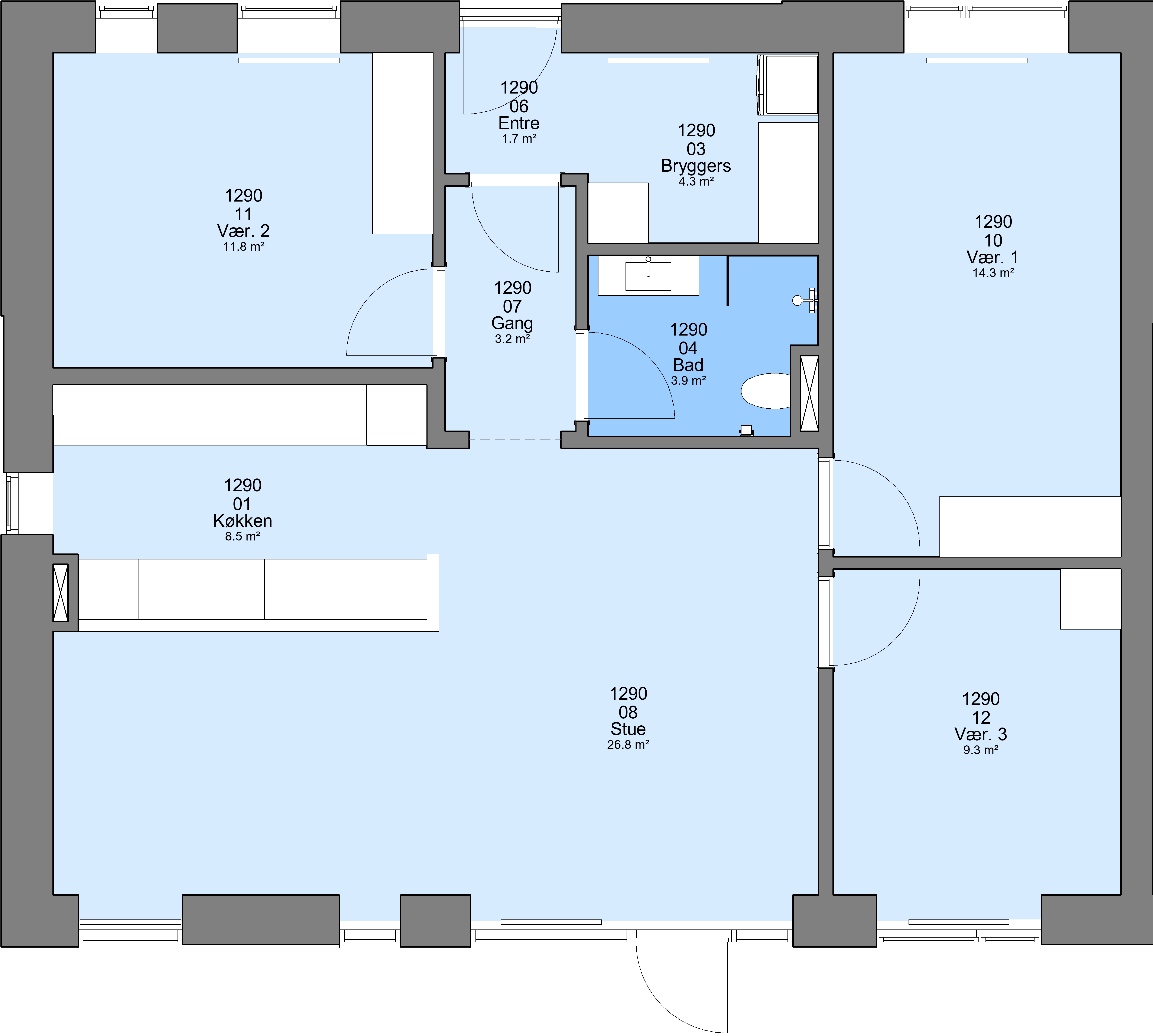 Boligerne med 3 rum er i to plan. Der er 11 stk. 4 rums boliger, som er uden trapper.