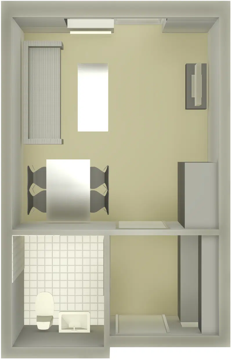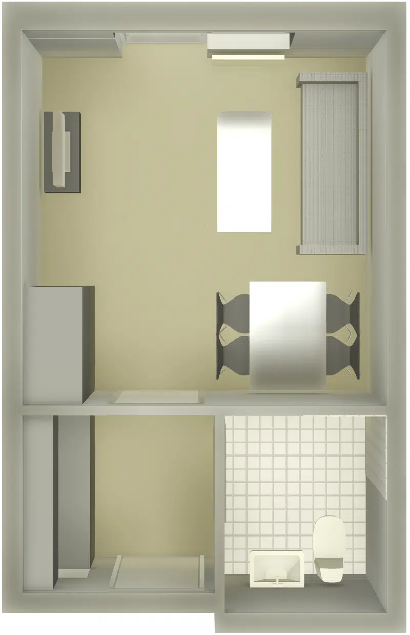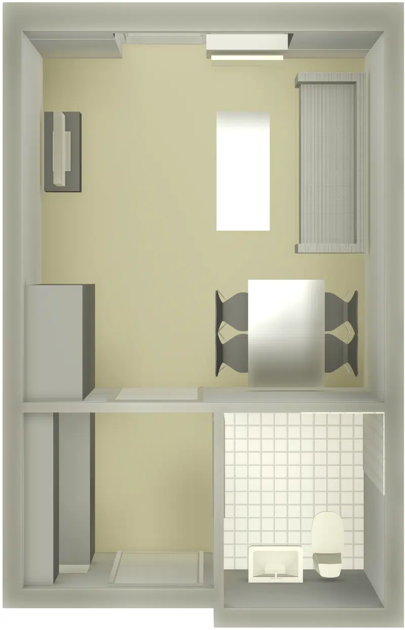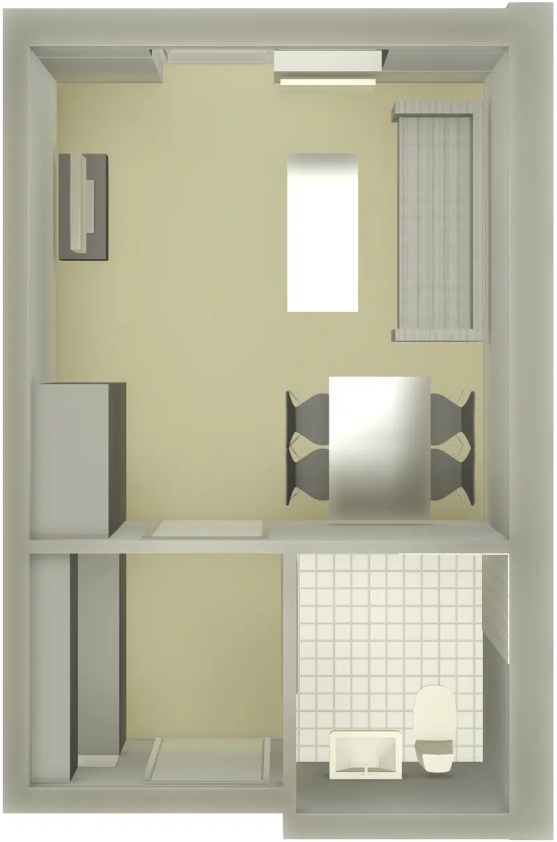Der hører kogeplader, emhætte og et køleskab med en lille frostboks med til ungdomsboligen.