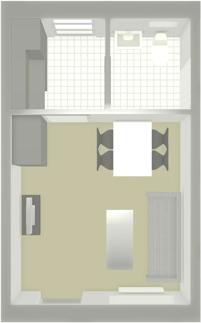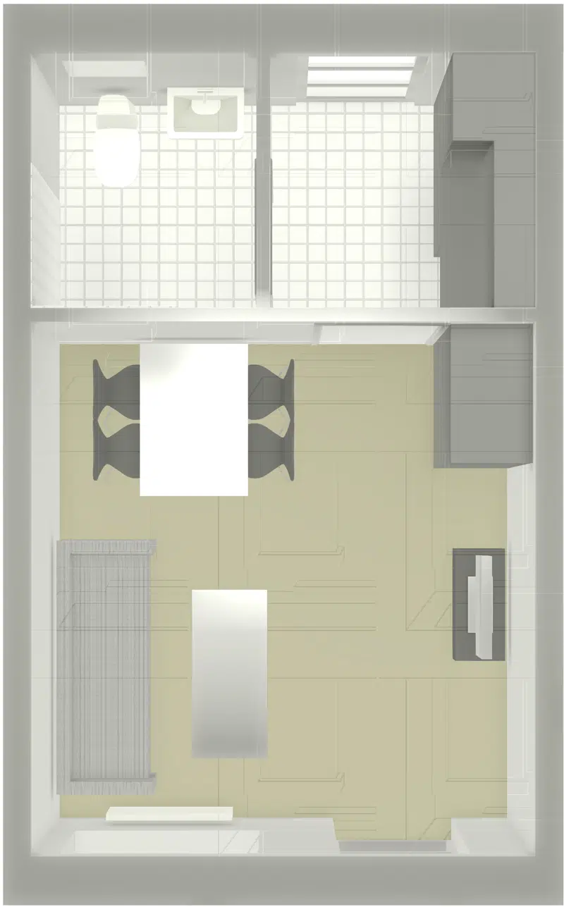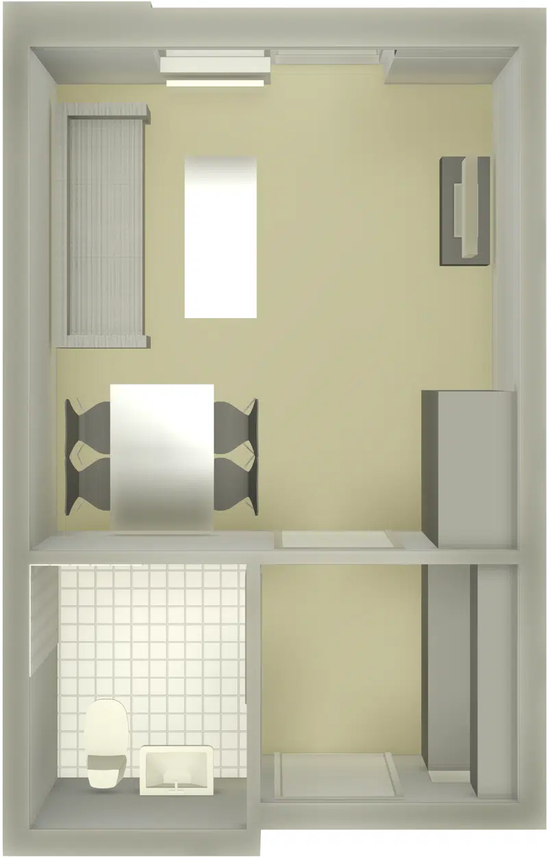 Der hører kogeplader, emhætte og et køleskab med en lille frostboks med til ungdomsboligen.
