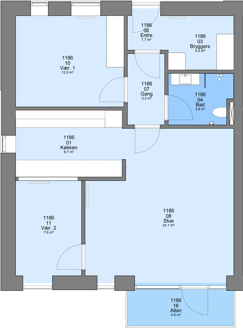 Der er altan til boligerne med indgang på 1. sal. Boligerne med indgang i stueetagen har en terrasse.