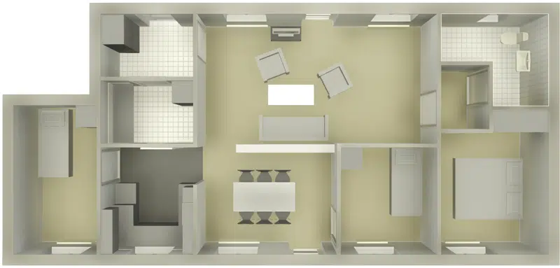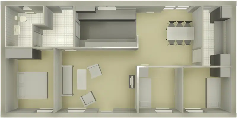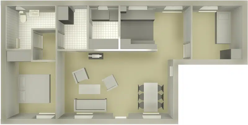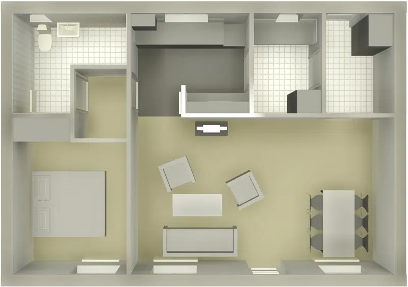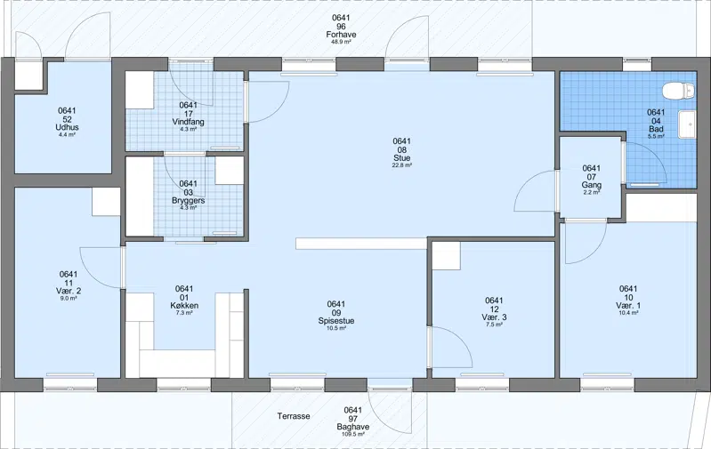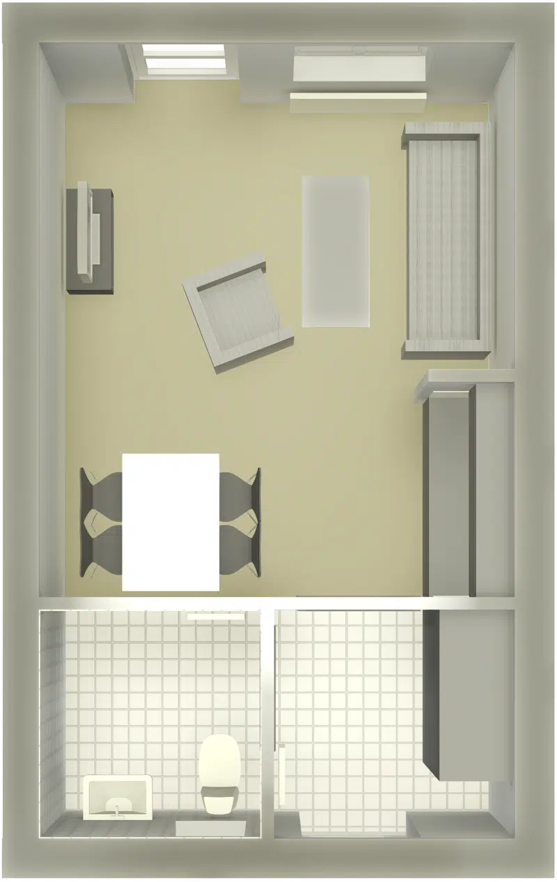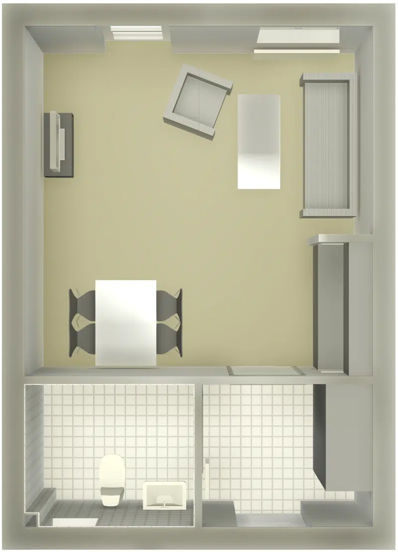 Der hører komfur, ovn og emhætte med til lejligheden. I ungdomsboligerne er der kogeplader, emhætte og et køleskab med en lille frostboks.
