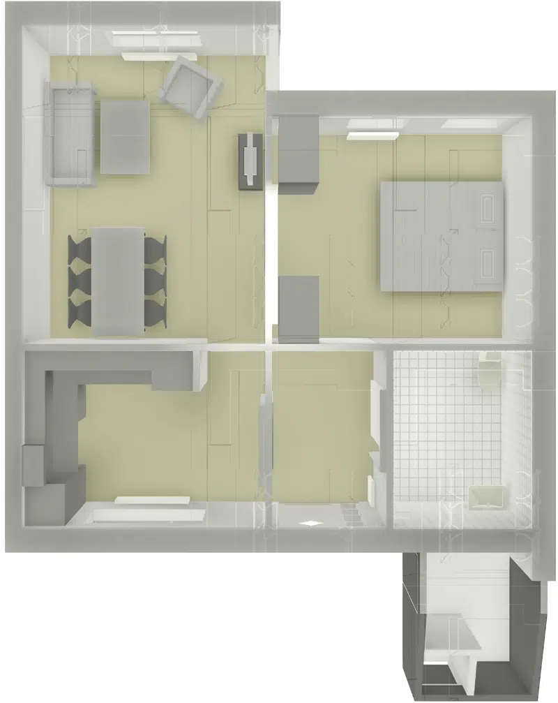 Der hører køle-/fryseskab, komfur, ovn, emhætte, Vaskemaskine, tørretumbler og micro-ovn med til lejligheden.