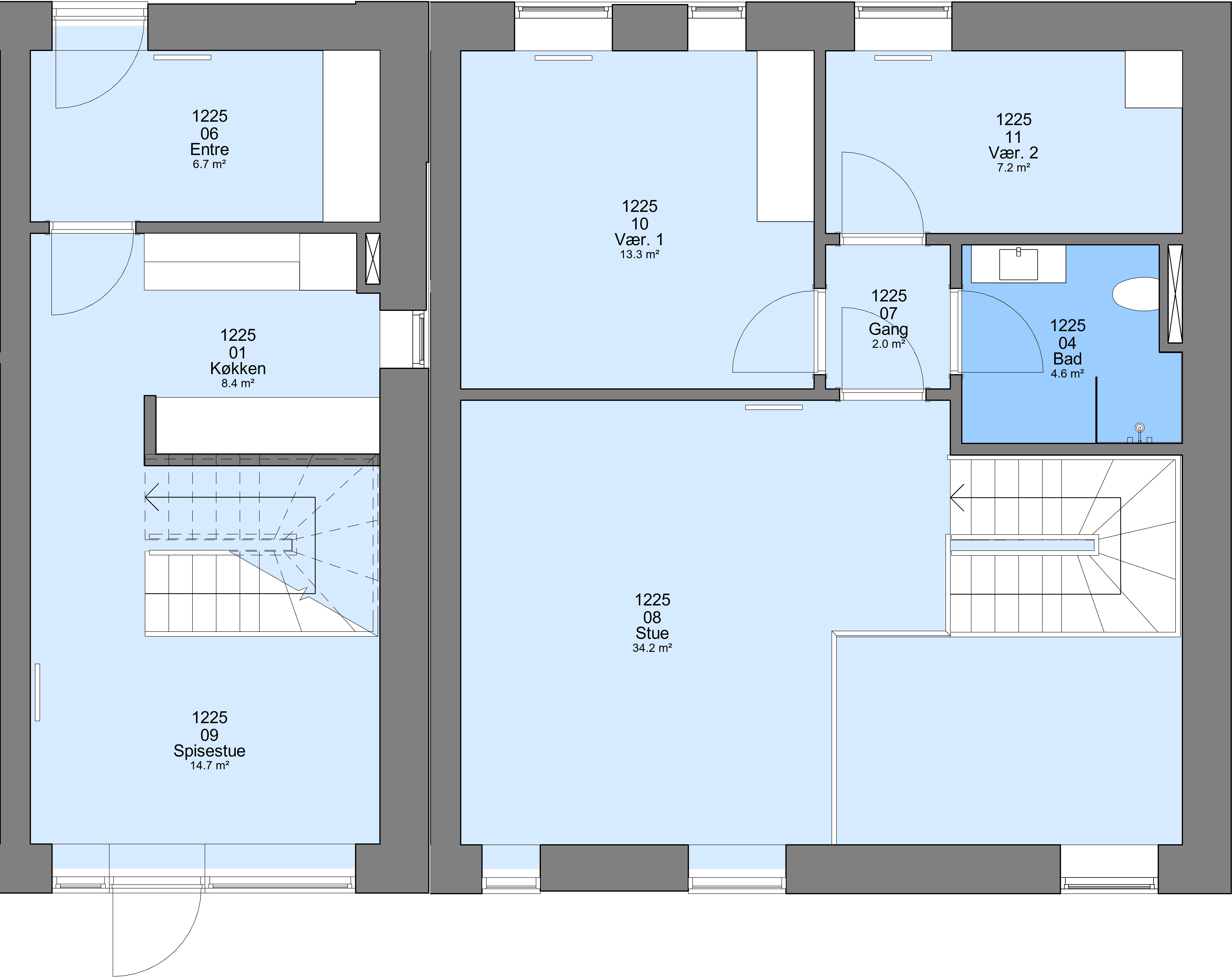 Boligerne med 3 og 4 rum er i to plan. Halvdelen af boligerne med 2 rum, har indgang på 1. sal.